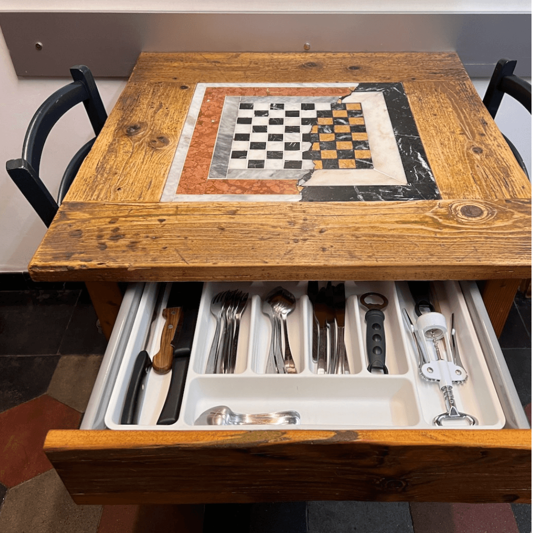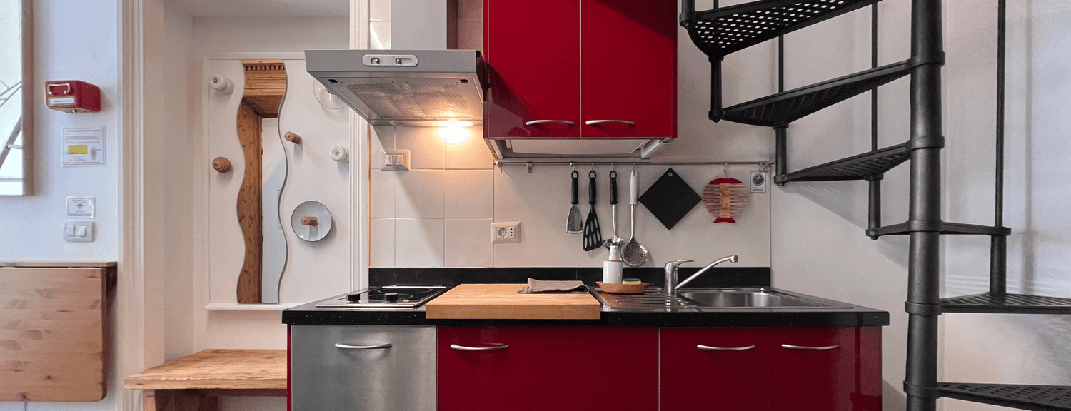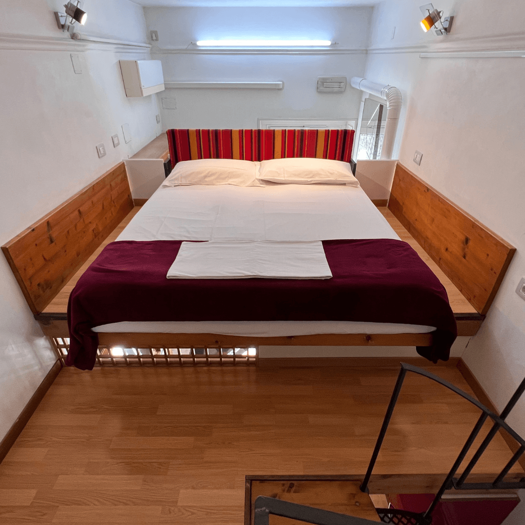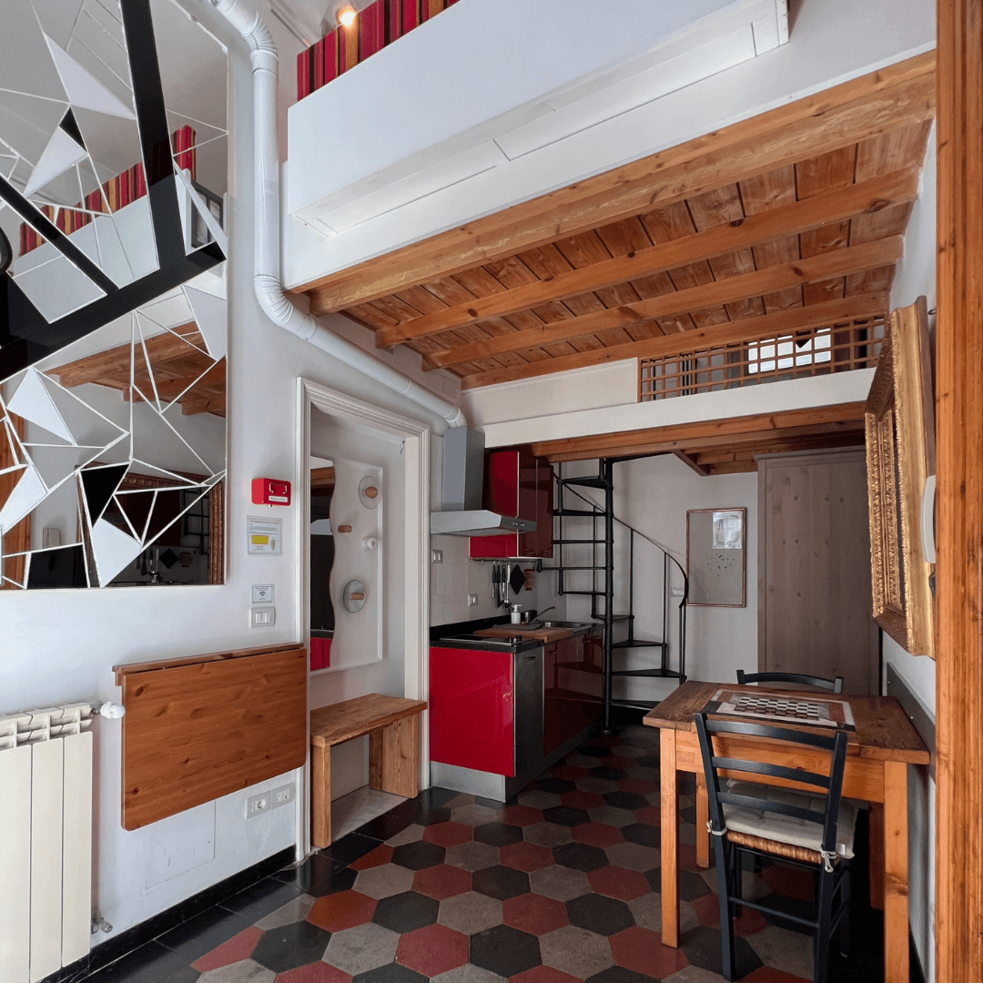 A small studio on the first floor with a small outdoor patio facing the courtyard. Entryway with a kitchenette equipped for meal preparation and a table for two. On the mezzanine, there’s a double bed area (160x190 cm) and a complete bathroom.