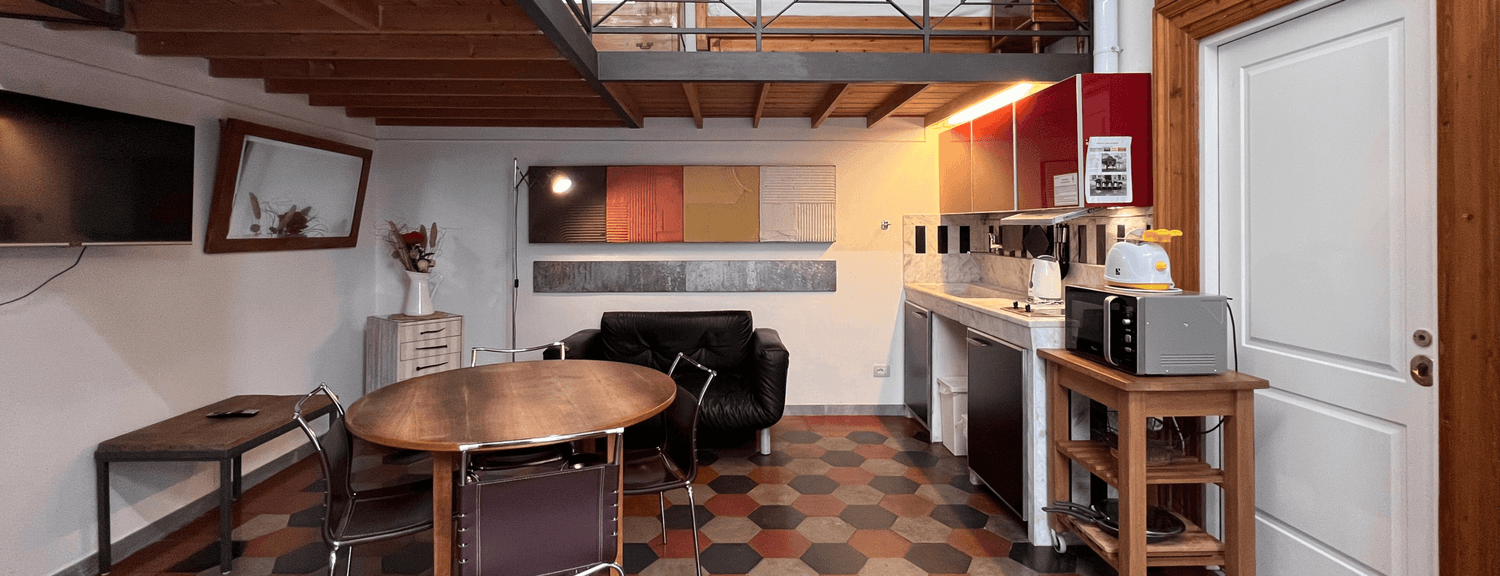 Apartment divided into two areas with loft beds. Accessing the sleeping areas requires climbing stairs to the lofts. Not suitable for people with mobility issues or very young children.
